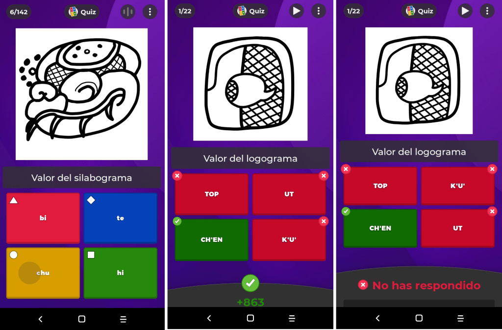 Los dos tipos de signos que se incluyeron en los kahoots son los silabogramas (fonogramas), signos que básicamente representan sonidos y los logogramas (morfogramas), signos que representan palabras completas con sus sonidos y significados. Las opciones de respuesta son las lecturas de dichos signos, lo que en términos académicos se llama transliteración y aparecen en negritas y minúsculas (silabogramas) o negritas y mayúsculas (LOGOGRAMAS). El usuario debe elegir cuál de las cuatro opciones considera que es la correcta. Si la respuesta es la apropiada, la app lo indicará, si es incorrecta, igualmente aparecerá en la app (imagen). Se tienen 30 segundos para responder por cada imagen, si el usuario no responde, aparecerá la notificación indicando la respuesta correcta (imagen 3).