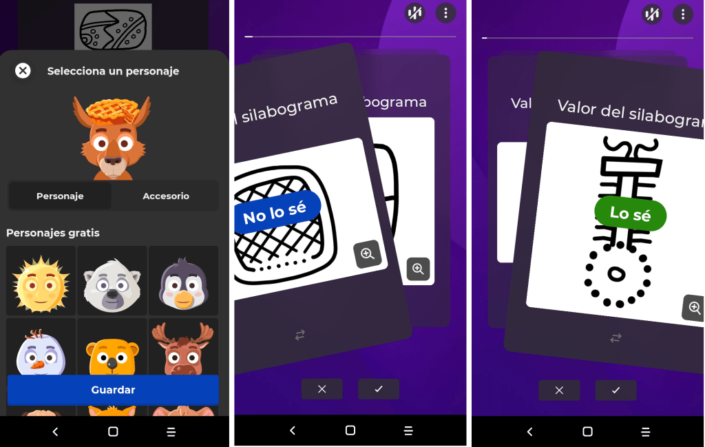 También se puede jugar por medio de flashcards (imagen 4): solo se tiene que elegir la opción de TARJETAS y, después, ir deslizando la tarjeta a la izquierda si no sabes el valor del signo, o bien, a la derecha, si lo conoces. La opción de CLÁSICO SOLO permite jugar y elegir un personaje para ir sumando puntos.