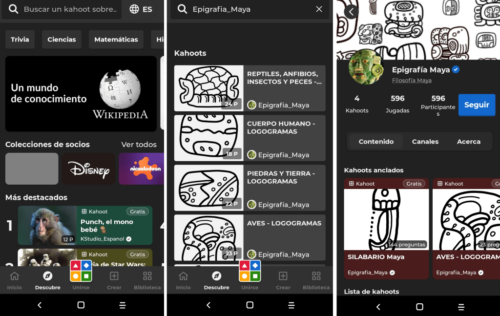 La interfaz se debe ver como en la imagen. Con la opción DESCUBRE y con la lupa, se pueden buscar los kahoots de escritura jeroglífica maya, los cuales aparecen en el perfil de Epigrafía Maya (o Epigrafia_Maya) de la siguiente manera (imagen 1). Aunque el material está disponible para todo el público, se recomienda haber tomado un curso de escritura jeroglífica maya antes de jugar.
