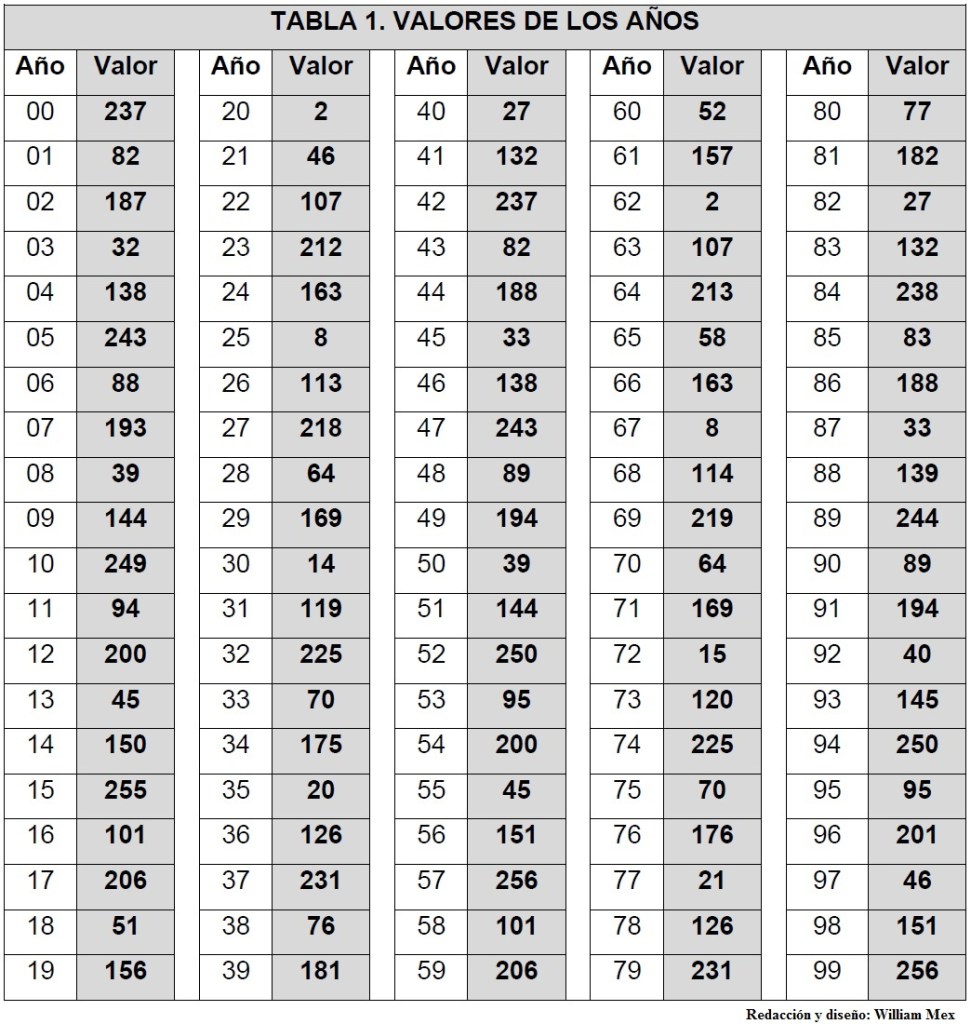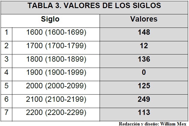 El ciclo de 52 años que se formó queda representado en la siguiente tabla: