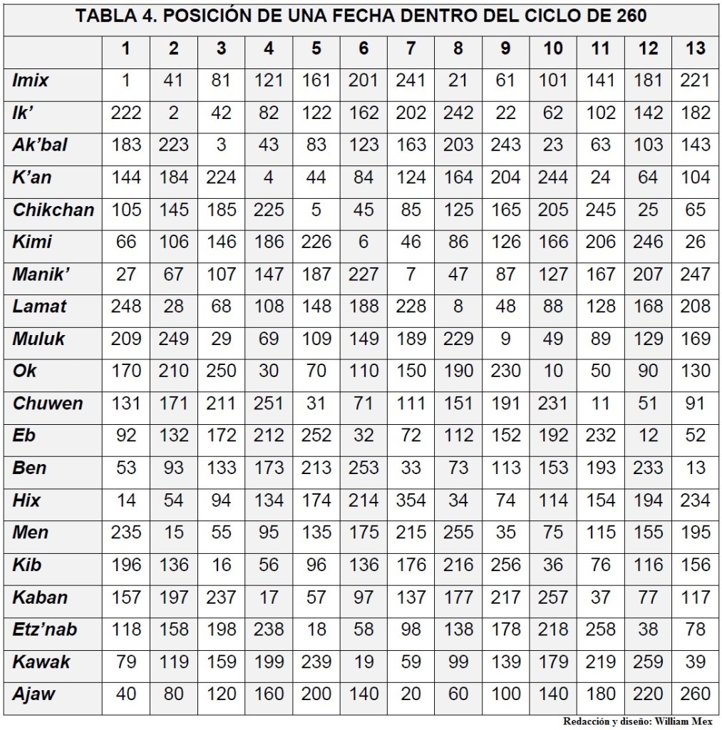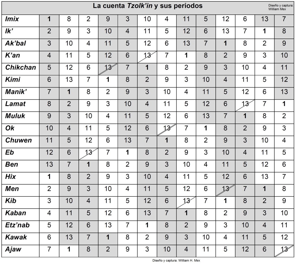 Como se mencionó al inicio de este texto, la cuenta Tzolk’in consta de 260 fechas, cada una conformada por un número del 1 al 13 y por un nombre de los 20 días (ver Tabla)[2]. Por ejemplo, la cuenta puede comenzar con 1 Imix, 2 Ik’, 3 Ak’bal, 4 K’an, 5 Chikchan, 6 Kimi, 7 Manik’, 8 Lamat, 9 Muluk, 10 Ok, 11 Chuwen, 12 EB, 13 Ben -> al llegar al número 13, los números inician de nuevo, pero los días siguen hasta el vigésimo -> 1 Hix, 2 Men, 3 Kib, 4 Kaban, 5 Etz’nab, 6 Kawak, 7 Ajaw -> al llegar al día Ajaw -vigésimo- los días inician de nuevo, pero los números siguen hasta el trece -> 8 Imix, 9 Ik’, etc. En un principio, se puede decir que la primera fecha es 1 Imix y la última, que ocurre después de 260 posiciones, es 13 Ajaw. La Tabla muestra el conteo de días comenzando desde arriba a la izquierda y avanzando de veinte en veinte (de 1 Imix a 7 Ajaw, de 8 Imix a 1 Ajaw, etc.).